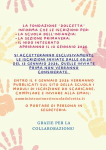 Entro il 9 gennaio 2026 verranno pubblicati sul sito della scuola i moduli di iscrizione da scaricare, compilare e inviare alla email all’indirizzo amministrazione@scuoladolcetta.it o portare di persona in segreteria.